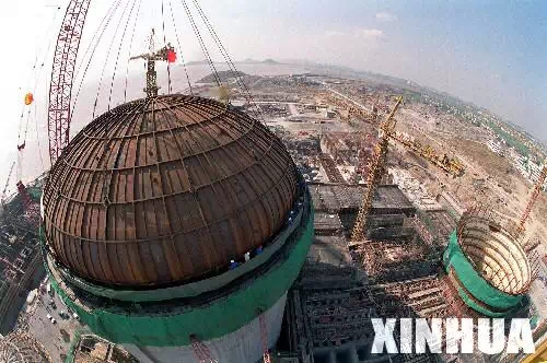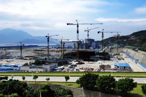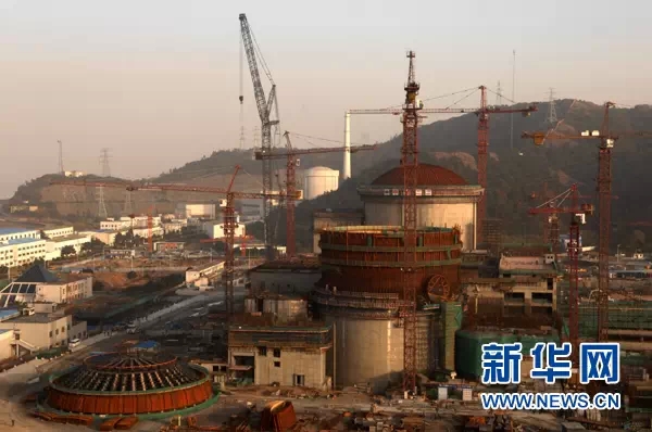 正在施工中的方家山核電工程的兩座核島。后方白色建筑即為1994年投入商業(yè)運(yùn)行的我國(guó)首座國(guó)產(chǎn)核電站秦山核電站一期工程。